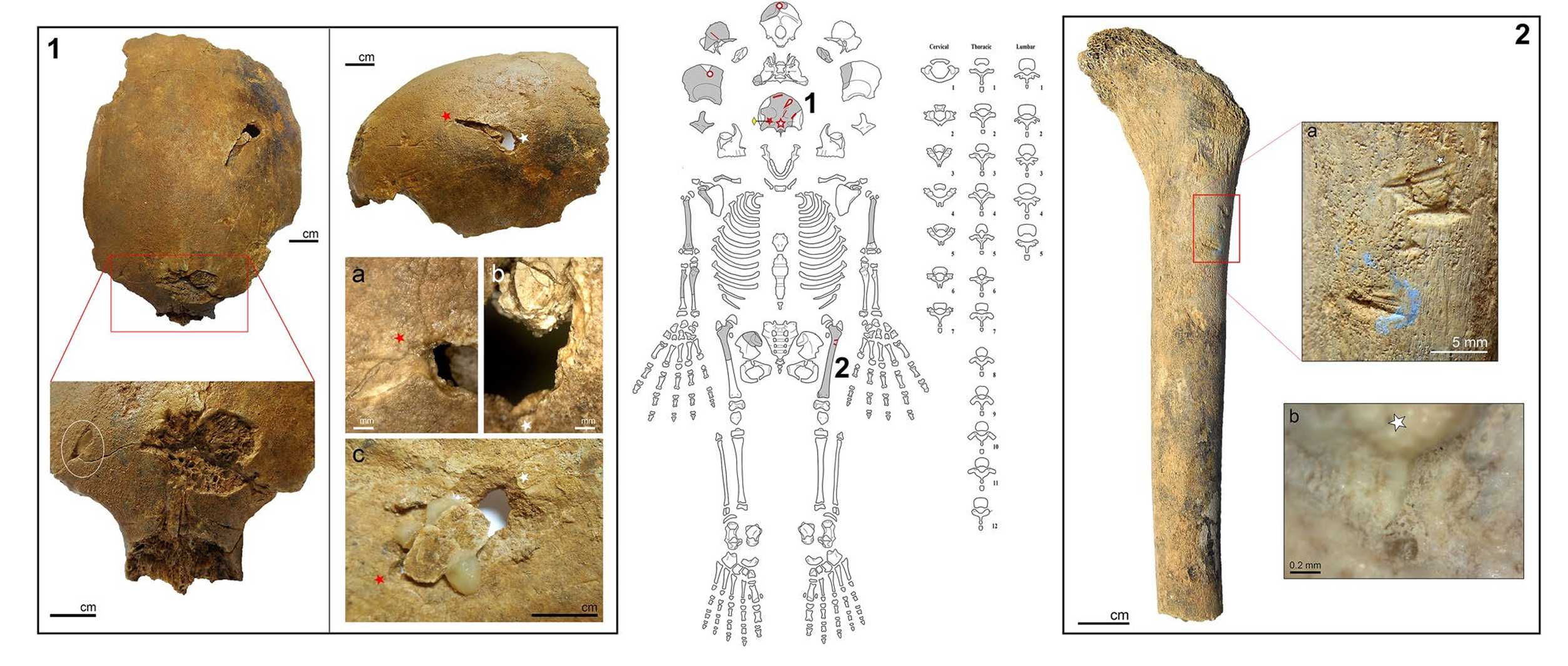 Encadré 1 : Crâne avec perforation non cicatrisée, artefact incrusté dans la perforation, traces d'impacts de projectile, fractures de charnière (a), fractures de compression (b).