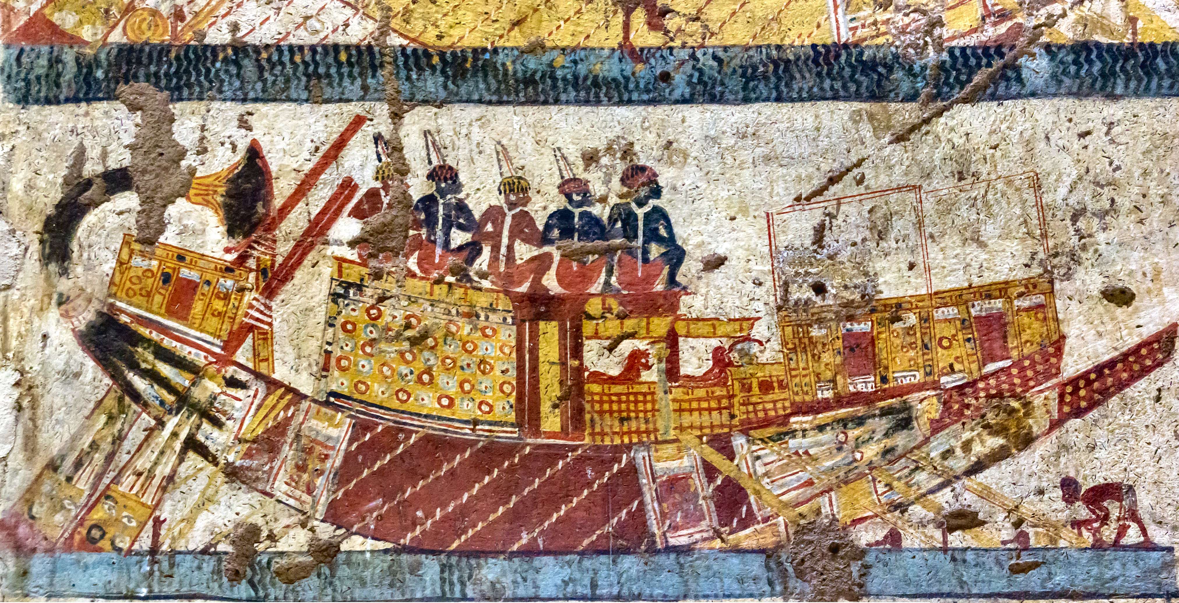 Sur ce relief, on peut voir clairement des prisonniers les mains dans le dos, l'un à droite du serekh (cf. plus bas), le second attaché en plus par le cou à la proue, au moyen de cordages, les autres prisonniers étant blessés ou morts non loin du bateau.