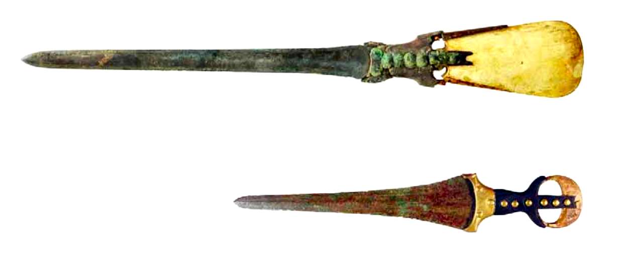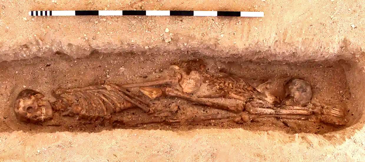 "Tombes d’un archer et d’une femme munie d’un bâton, phase II du Kerma ancien (2300- 2150 av. n.-è.). La tombe d’archer contenait deux individus: un jeune homme en position centrale et une femme déposée à ses côtés. Un chien, un arc, un éventail en plumes d’autruche et un miroir en bronze accompagnaient le jeune homme. La tombe avec un bâton contenait une femme de 20-29 ans. Ces deux tombes étaient partiellement pillées et une partie des squelettes a été graphiquement reconstituée en grisé"