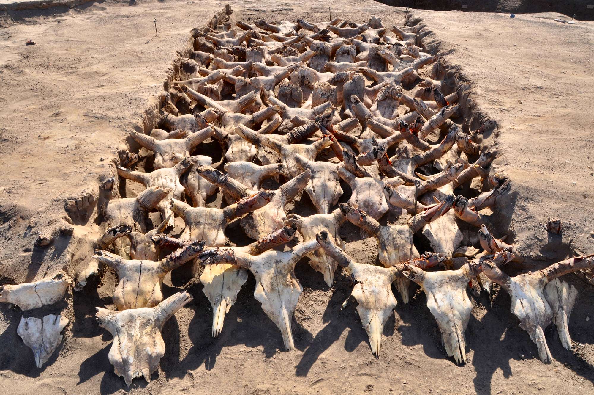 "Le changement observé dans les procédures rituelles à Kerma, c’est-à-dire, la mise à mort de dizaines, centaines, voire milliers de bovins et le dépôt en surface de leurs bucranes, est révélateur de la hiérarchisation croissante de la société vers la fin du 3e millénaire avant notre ère. Nous assistons à l’émergence d’individus ou de clans cherchant à se démarquer publiquement, en exposant ostensiblement et durablement leurs richesses, actes ou statuts sociaux (Meillassoux 1968). Le bétail est en effet considéré comme un signe de richesse et de prestige dans les sociétés agropastorales et pastorales est-africaines (Hazel 1979 ; 1981). De tels rites nécessitent probablement la participation de spécialistes chargés de réunir les bovins à abattre, de les découper et de disposer régulièrement leurs crânes autour des tumulus. La possession du bétail pourrait avoir joué un rôle essentiel dans la formation et le maintien du pouvoir politique et de l’autorité sacrée ou royale à Kerma" (Dubosson, 2015).