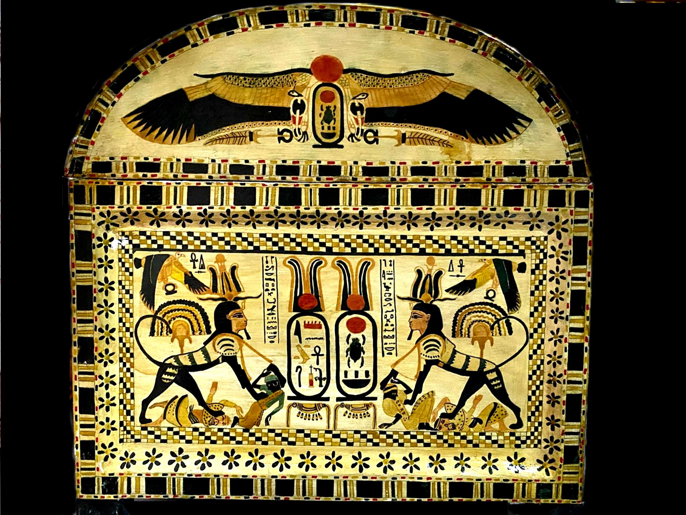 Cette dernière est habituellement inscrite dans le serekh (litt. "bâtiment"), sous la figure d'un ou deux Horus (le dieu faucon), symbole du palais royal, visible tout à gauche de la scène.