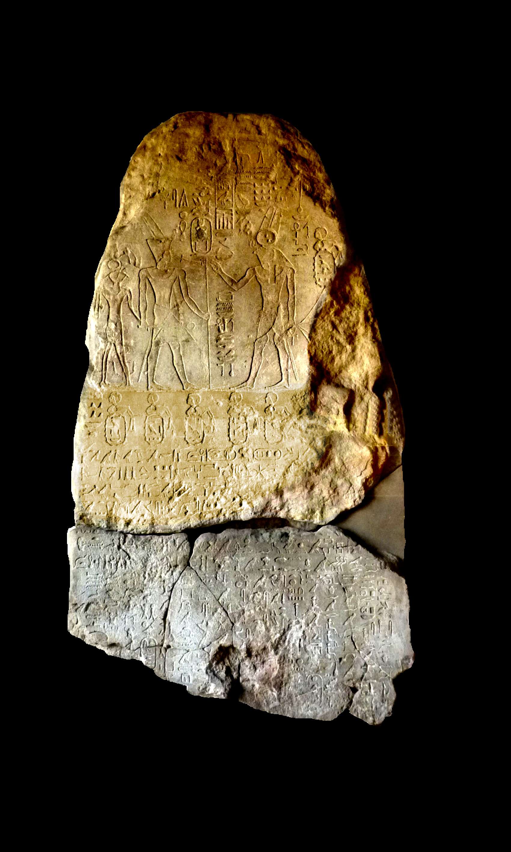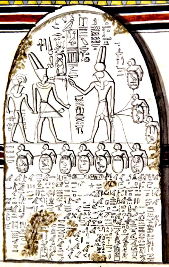 On y voit le dieu égyptien de la guerre, Montou, tenir dix Nubiens attachés pour les conduire au roi (cf. le dessin de Ricci, ci-contre, qui a figuré l'ensemble de la scène, avant la détérioration de la stèle). Ils symbolisent "tous les pays qui sont dans Ta-Séty" (Ta-Séti : "Le pays de l'arc"), nom que donnait alors les Egyptiens à la Basse Nubie. Les noms de ces pays sont indiqués sur le cintre de la stèle "Chémyk, Khésaï, Chaât [Ile de Sai ?, NDA], Ikherqyn, ?, ?, Ima (?)». Série verticale (de haut en bas): «Kas [Kouch, NDA], Haou, Ya (?) »" (in Obsomer, 2007b).