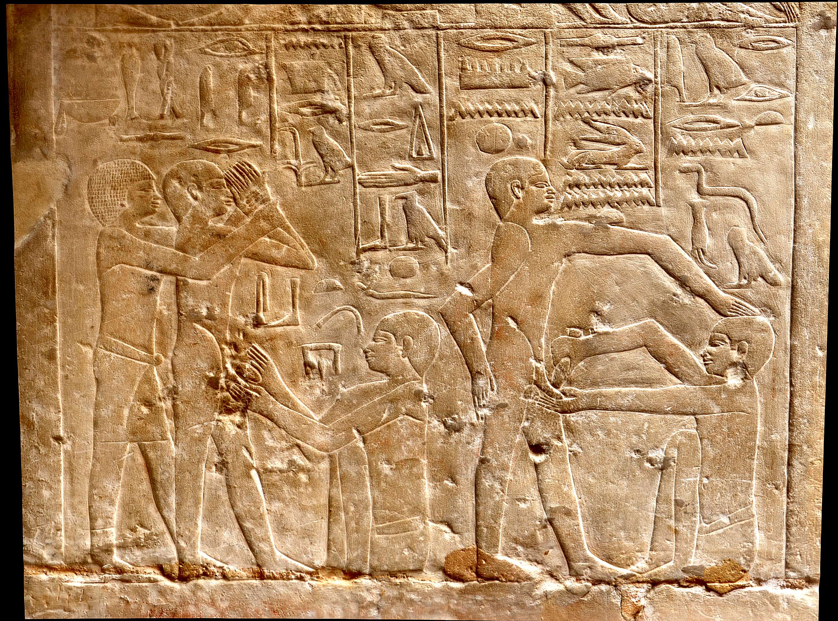 "À droite, un garçon est debout, à l’aise, sa main gauche sur la tête d’un homme accroupi devant lui. L’homme applique quelque chose sur le pénis du garçon, probablement pour rendre l’opération moins douloureuse, ce que confirment les hiéroglyphes qui accompagnent la scène : « Je la rendrai agréable». Le patient répond : « Frotte-le bien pour que ce soit efficace. » À gauche, une troisième personne, debout derrière le garçon, le tient d’une main ferme, tandis qu’un prêtre hem-ka exécute l’opération" (Tomb, 2022).