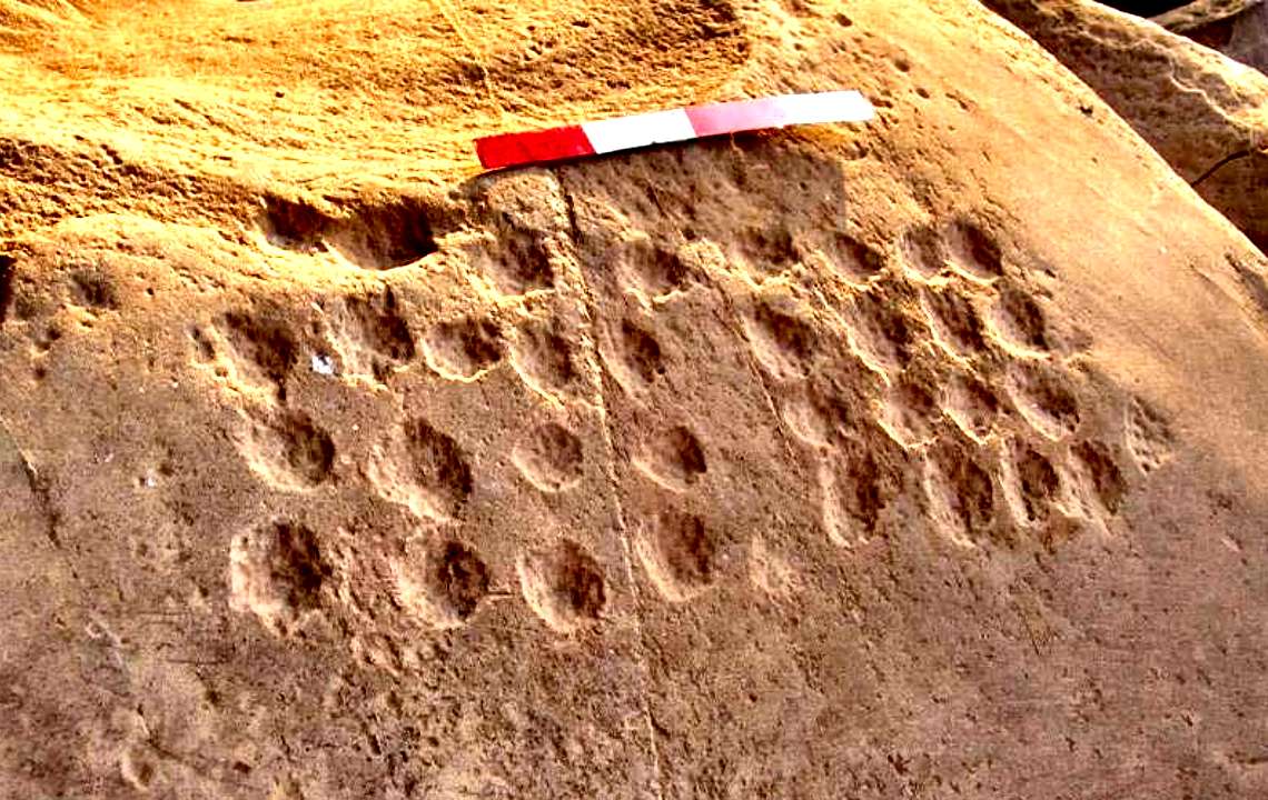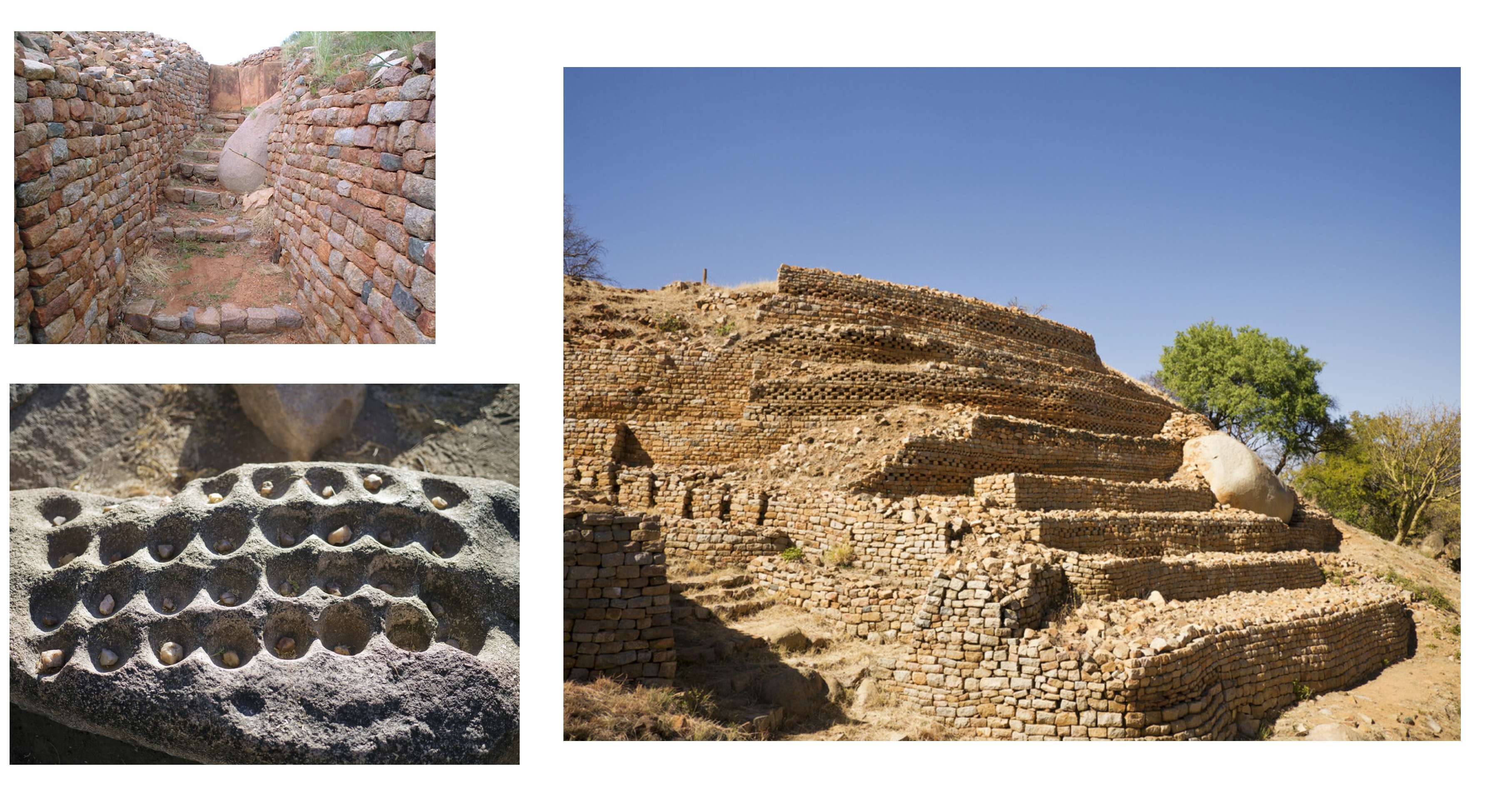 Ruines de Khami, capitale du royaume de Butua (Butwa), dynastie Torwa , ethnie Kalanga, 1450-1560. On remarquera le traditionnel mankala, creusé dans la roche.