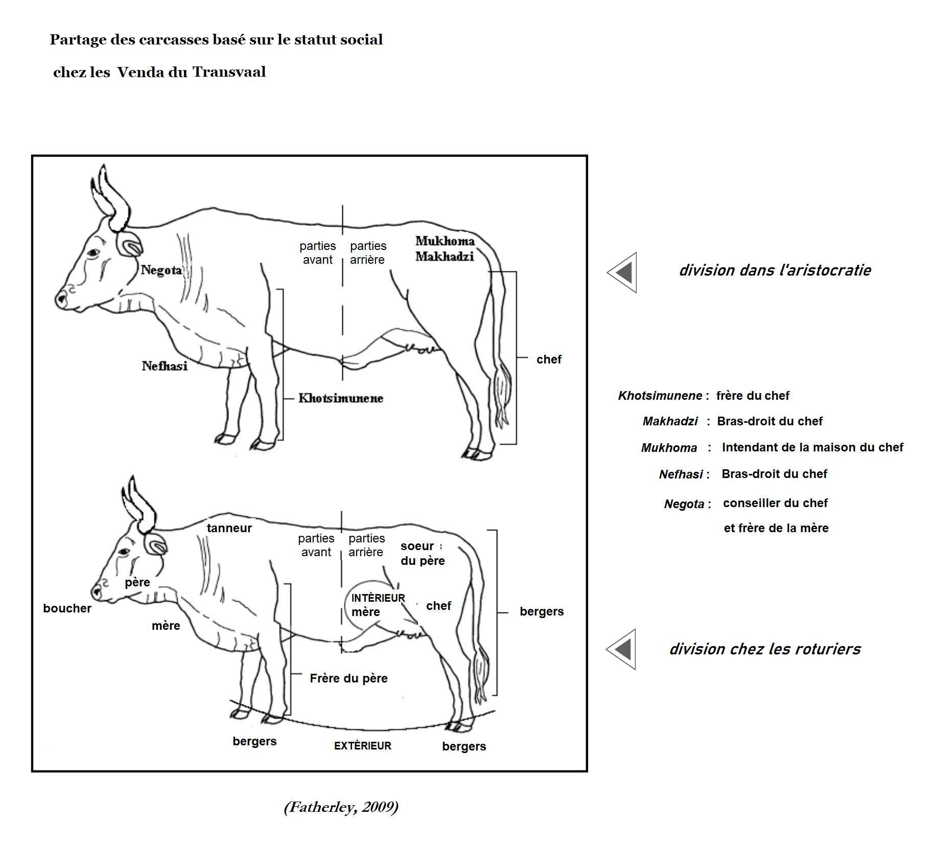 Cependant, le travail des ethnoarchéologues, Thomas Huffman, en tête, met en lumière un certain nombre de traits communs aux cultures bantoues anciennes et modernes qui nous intéressent beaucoup ici. En effet, les connaissances ethnologiques ont permis d'étudier de près les restes de carcasses trouvées par les archéologues dans les kraals (enclos à bétail), placés longtemps au centre du village, non loin desquels habitait le chef de la communauté. Le faciès de K2, bien étudié, présente ainsi un modèle d'infrastructure repéré par Adam Kuper (Kuper, 1982) et repris par Huffman pour une analyse ethnoarchéologique, en particulier chez les Venda. Au sein de cette ethnie, étudiée en particulier par Hugh Arthur Stayt ("The Bavenda", 1931, Londres, Presses de l'Université d'Oxford), le bétail, tout d'abord, demeure, hier comme aujourd'hui, un élément prépondérant de prestige. Il détermine l'importance de la dot (lobola), et son enclos, le kraal, est toujours un symbole éminent de la puissance des mâles. Par ailleurs, la découpe des carcasses des animaux de boucherie est encore très réglementée, par genre et par ordre de préséance, comme cela a été confirmé pour leurs lointains ancêtres. On ne s'étonnera donc pas que l'étude des carcasses trouvées dans le kraal central de K2, par exemple, ait révélé une importance significative de morceaux de choix réservés aux hommes, appartenant surtout à l'élite. Il n'est que de constater la division genrée et très hiérarchisée effectuée lors de l'abattage des bêtes par les Venda au XXe siècle, pour le comprendre :