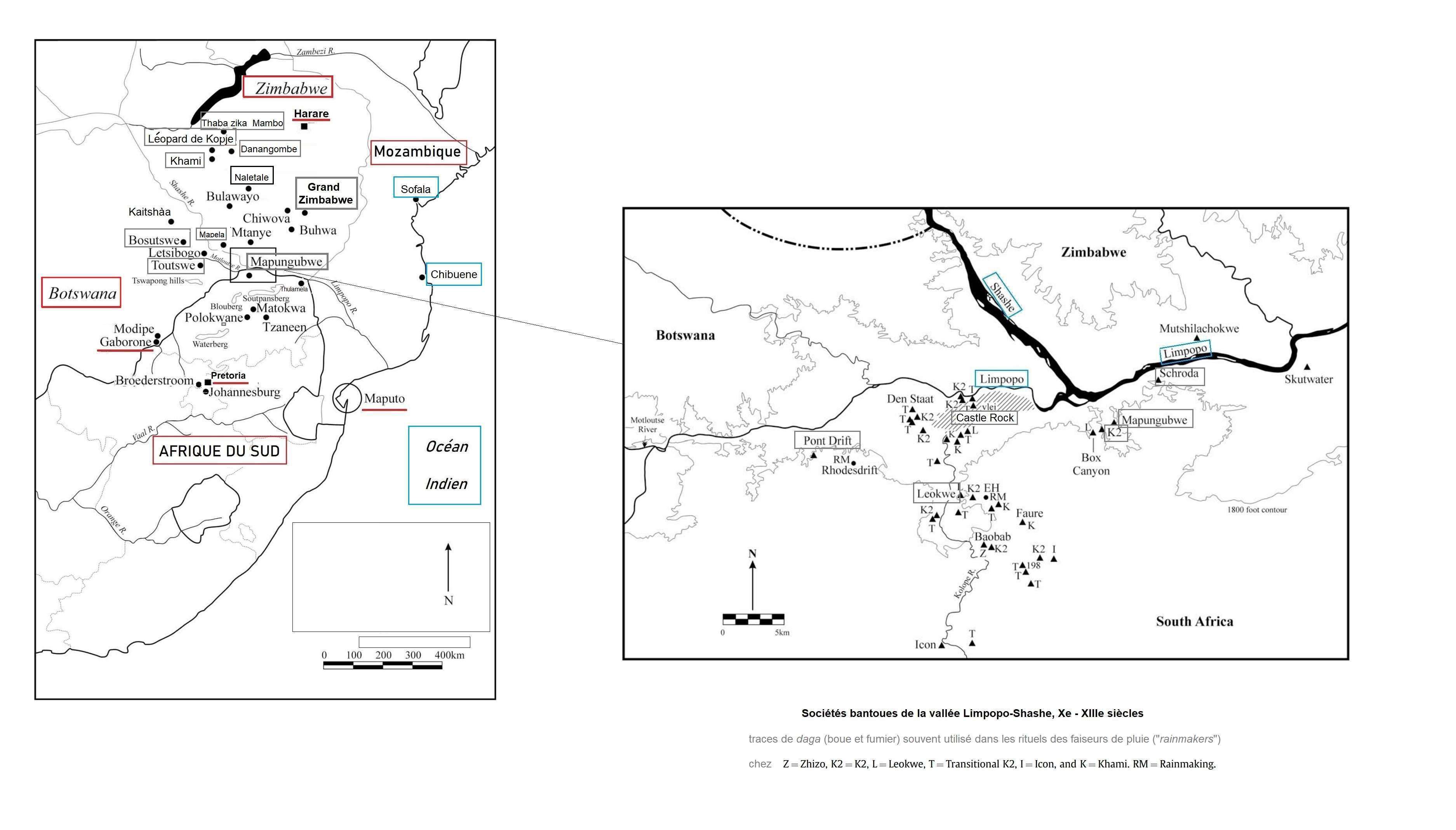 De nouveaux déplacements de populations s'opèrent vers 1300, qui s'installeront entre les fleuves Zambèze et Limpopo (voir carte), sur le plateau central du Zimbabwe, en particulier, cela a été dit, de Mapungubwe au Grand Zimbabwe, pour y demeurer jusqu'à 1500, environ, époque à laquelle le climat de la région a commencé de devenir plus froid et plus sec, obligeant les communautés à la quitter pour des cieux plus cléments, dans la région de Khami, de Naletale (Nalatale), Danangombe (Danamombe, Dhlodhlo, Dhlo Dhlo), conquise plus tard par les Rozwi, au XVIIe siècle, ou encore Taba (Thaba) zika Mambo ("colline du roi"), qui a très peu été étudiée à ce jour : On voit clairement ici que la civilisation très hiérarchisée qui a fleuri entre le Limpopo et le Zambèze dépasse de loin le cadre de Mapungubwa ou du Grand Zimbabwe et son histoire n'a toujours pas été restituée dans toute son ampleur et sa complexité.