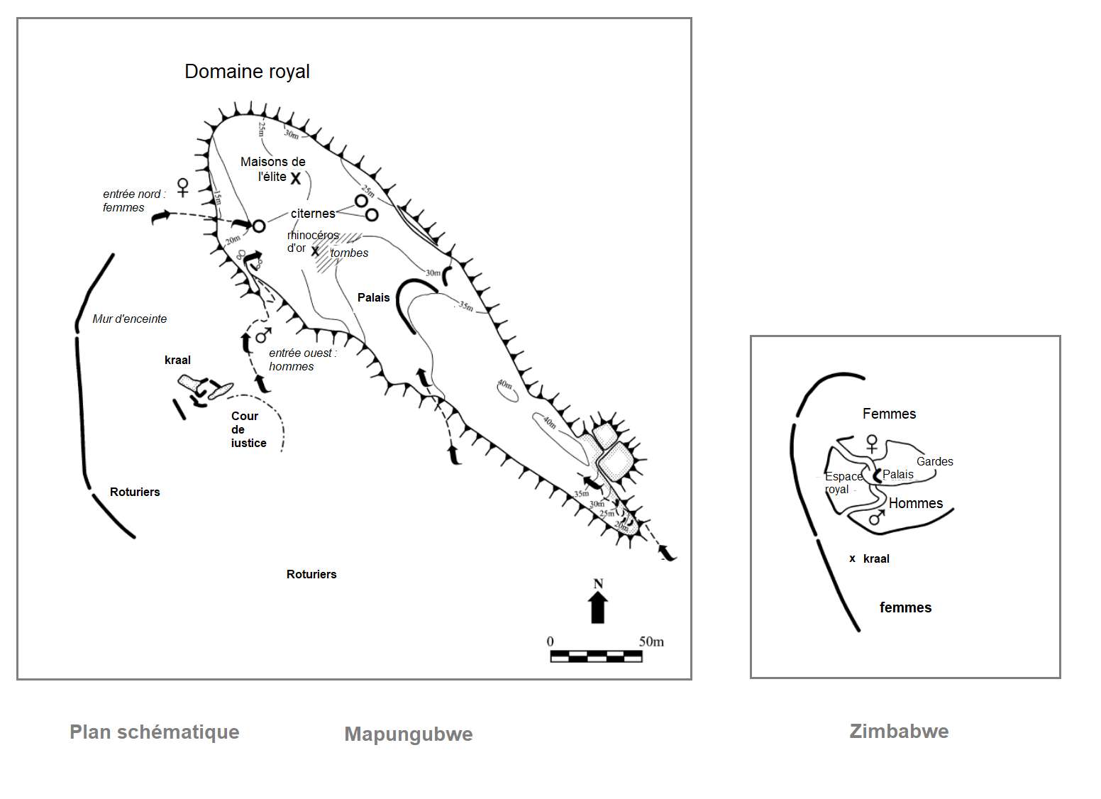 Après la première période de Mapungubwe, l'organisation du pouvoir se complexifie quelque peu et chaque centre zimbabweéen se doit de posséder, selon Huffman cinq structures de base : un palais, une cour, une enceinte pour les épouses du chef, un lieu pour les partisans et un autre pour les gardes (Huffman, 2009). Pour toutes les raisons déjà évoquées, nous n'approfondirons pas ici l'analyse détaillée qu'a fait Huffman, ou d'autres ethnoarchéologues, des structures socio-politico-religieuses des premiers royaumes d'Afrique australes, qui demeurent des extrapolations pleines d'incertitudes.