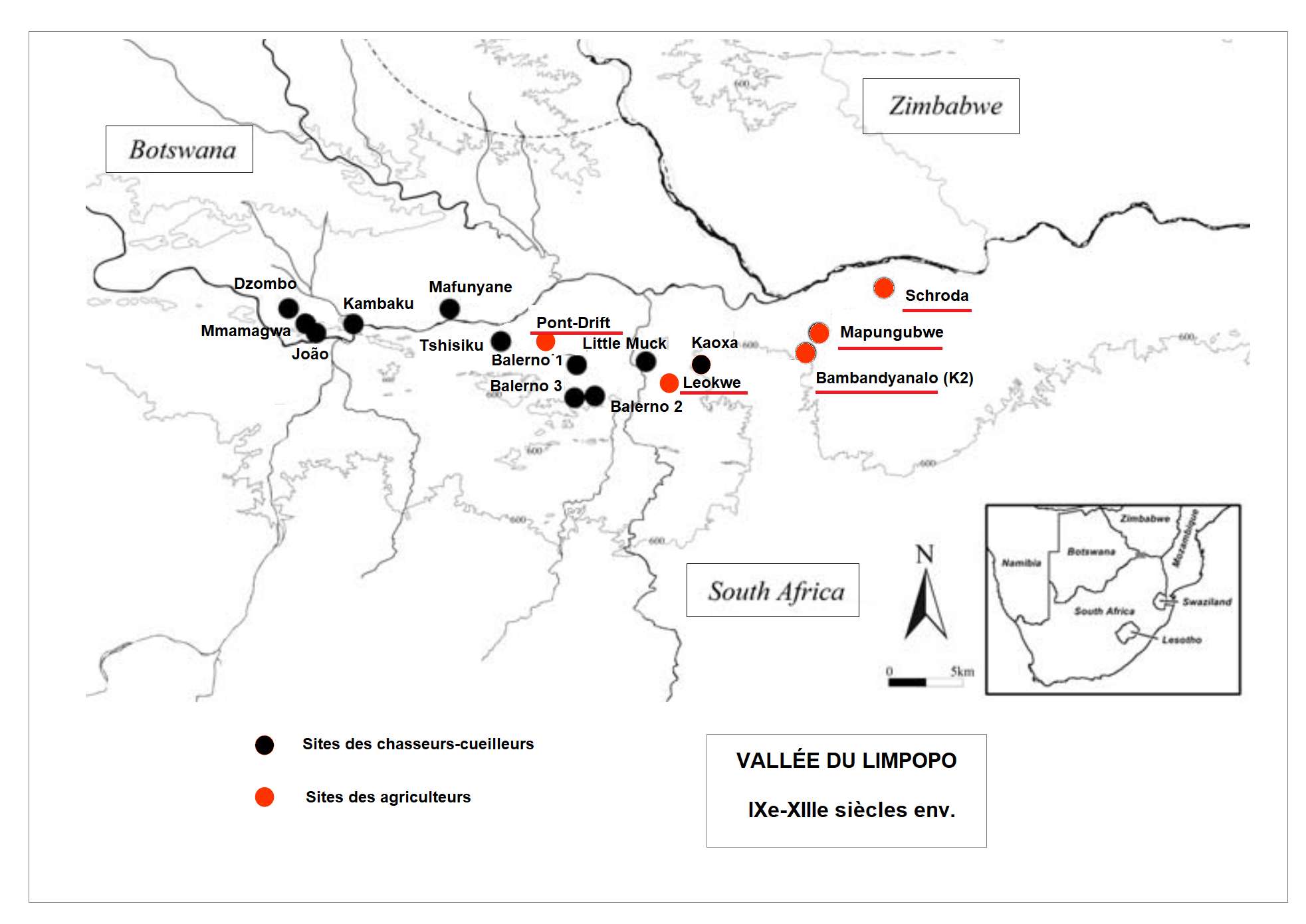 Entre le IXe et le XIIIe siècle, la région se présente comme un laboratoire social très riche d'intérêt, qui nous montre la complexe transformation de communautés passant d'une organisation socio-économique semble-t-il relativement égalitaire, cela a été dit, à une société de plus en plus centralisée et hiérarchisée. Au IXe siècle de nombreux sites sont habités par une communauté d'agriculteurs-éleveurs, les Zhizo, dont Schroda est le village principal (voir carte). Le climat n'étant alors pas des plus favorables, la région subissant une relative sécheresse, les Zhizos s'installent vers 900 dans la vallée de Limpopo en vue de chasser l'éléphant pour son ivoire, qu'ils commercent avec les marchands de l'océan Indien, sur la côte swahilie (Huffman et al., 2003 ; Smith, 2005). Les archéologues ont retrouvé à Kaitshàa ou à Schroda de nombreuses perles de verres qu'ils recevaient en plus de vêtements, contre l'ivoire, mais aussi des céréales, des peaux de bêtes ou des objets en métal. Ces perles, fabriquées au Moyen-Orient, peut-être dans la région du golfe Persique (Wood, 2015), passaient par les principales plaques tournantes du commerce de la côte swahilie, Chibuene, d'abord, dans la baie de Vilanculos, au sud du Mozambique, d'où proviennent les premières perles trouvées en Afrique du Sud, puis, Sofala, 250 km plus au nord (cf. carte et Traite orientale préislamique). En 916, toujours durant son voyage en Afrique de l'Est, Al-Masudi est témoin de ce commerce d'ivoire venu des pays des Zandj, et exporté via la côte swahilie vers "Oman, l'Inde et la Chine" (Al-Masudi, vers 893-956, مُروجُ الذَّهَب و مَعادنُ الجَوهَر, Murūj adh-dhahab wa-ma'ādin al-jawhar : "Prairies d'Or et mines de pierres précieuses", vers 943, XXXIII). Al-Masudi évoque aussi l'abondance de l'or du pays de Sofala (bilad as Sufala),