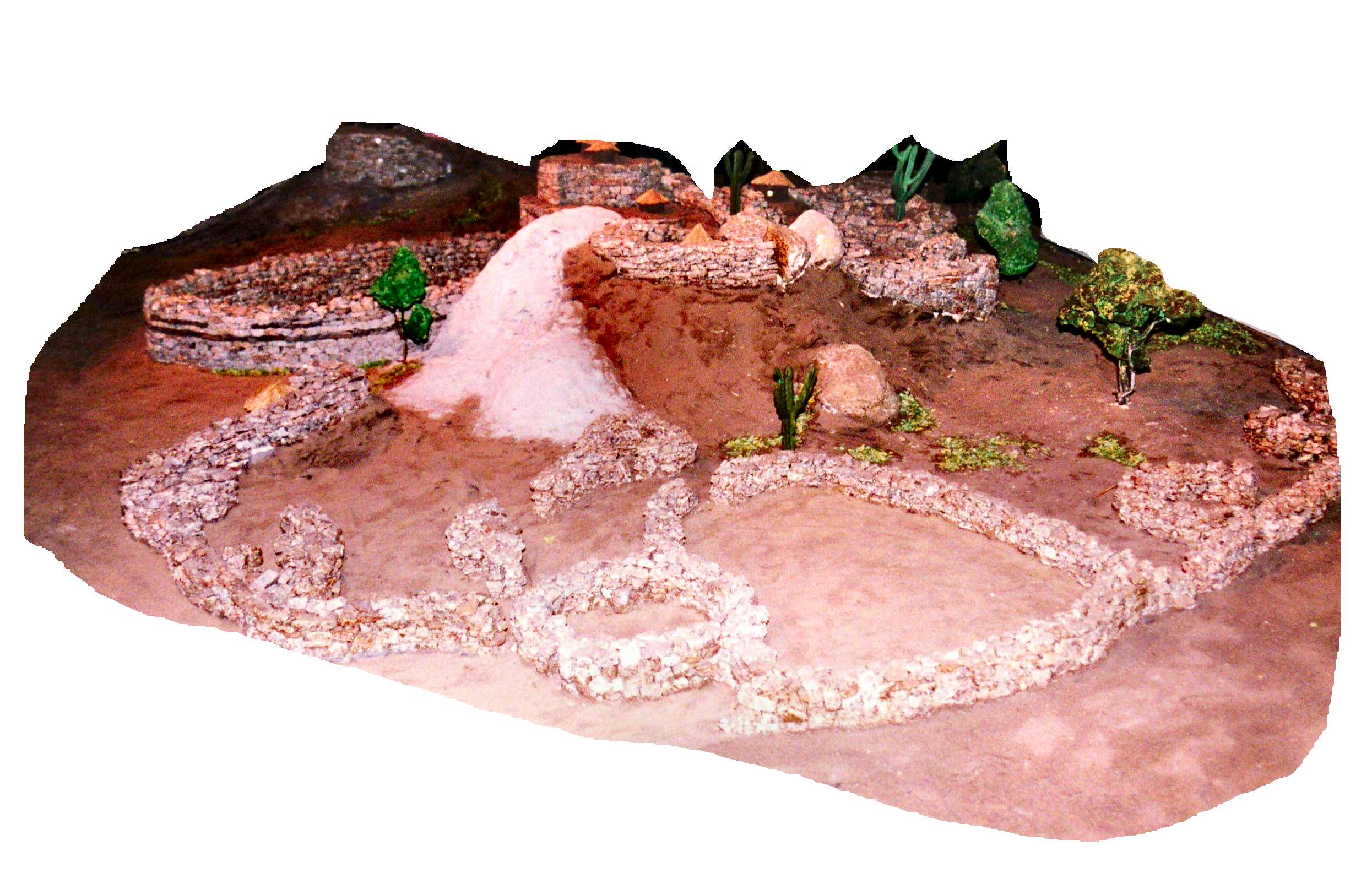 Reconstitutions, qui montrent la traditionnelle séparation de l'habitat. Au sommet des collines, les chefs, sur les terrasses supérieures, les élites, et le peuple sur les terrasses inférieures et au niveau du sol.