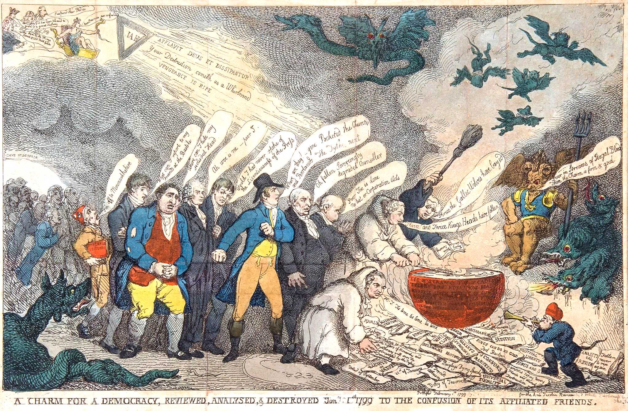 "A charm for a democracy", caricature de l'Anti-Jacobin Review sur la grande conspiration radicale contre l'ordre sociale. C'est la procession de New Morality des "villains", à savoir Thelwall et ses amis politiques : Godwin, Coleridge, Southey, Holcroft et Priestley, en particulier.