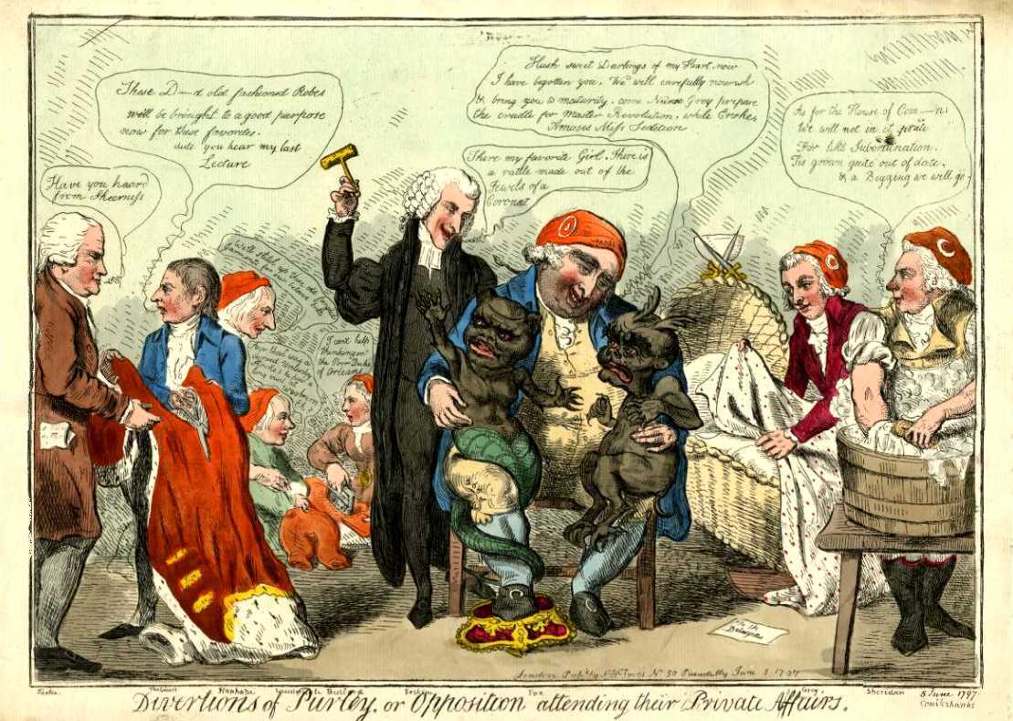 Caricature qui présente Took et Thelwall, à gauche, de mèche avec, de gauche à droite, les "whigs aristocratiques", le baron Erskine, Charles James Fox, le comte de Grey et Richard Brinsley Sheridan, pour fomenter des agitations populaires et renverser la monarchie. Les deux radicaux sont accusés d'avoir eu un rôle actif dans les mutineries navales au mouillage de la Nore, près de la côte du Kent à Sheerness, mais aussi à Spithead, Portsmouth.