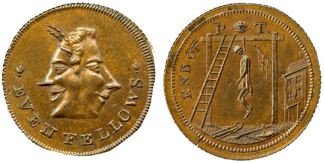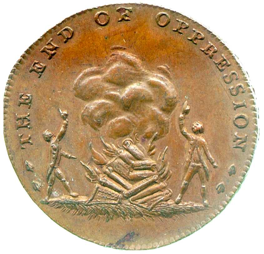 Le jeton fait la publicité de l'ouvrage de Spence, "The end of oppression, being a dialogue between an old mechanic and a young one. Concerning the Establishment of the Rights of Man", publié en 1795.