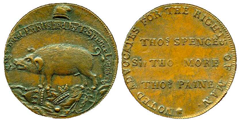 Fils d'un cordonnier écossais, Thomas Spence est très tôt influencé, avec sa famille, par l'action politique radicale du révérend presbytérien James Murray, qui officie dans la chapelle de High Bridge, à Newcastle et qui répand des tracts contre la fiscalité, les enclosures, la politique britannique en Amérique. Il encourage même sa communauté au nivellement, au partage des biens (cf. Ashraf, 1983). En 1771, Spence participe avec lui à une lutte contre l'enclosure d'une partie commune de Newcastle appelée Town Moore. Seule la détermination des habitants permettra en 1773 d'écarter la décision du Commun Council, et la population avait fêté cette victoire par des toasts patriotiques, des illuminations, des processions, et même, des bagues commémoratives (CRLC, voir bibliographie). Lui-même fera graver plus tard des jetons (tokens) en honneur de l'événement. Entre 1790 et 1800, se répandent en effet ce nouvel objet de propagande politique (mais aussi de collection), que Spence va beaucoup utiliser (dès 1793), comme d'autres, en particulier pour la caricature. Par ailleurs, avec la pénurie de monnaie à l'époque, certains employeurs créaient des jetons pour servir de monnaie (trade tokens) et que Spence, comme d'autres imitait, en toute illégalité (Révauger, 1998) pour une publicité militante ou parfois de vente, à destination des collectionneurs.