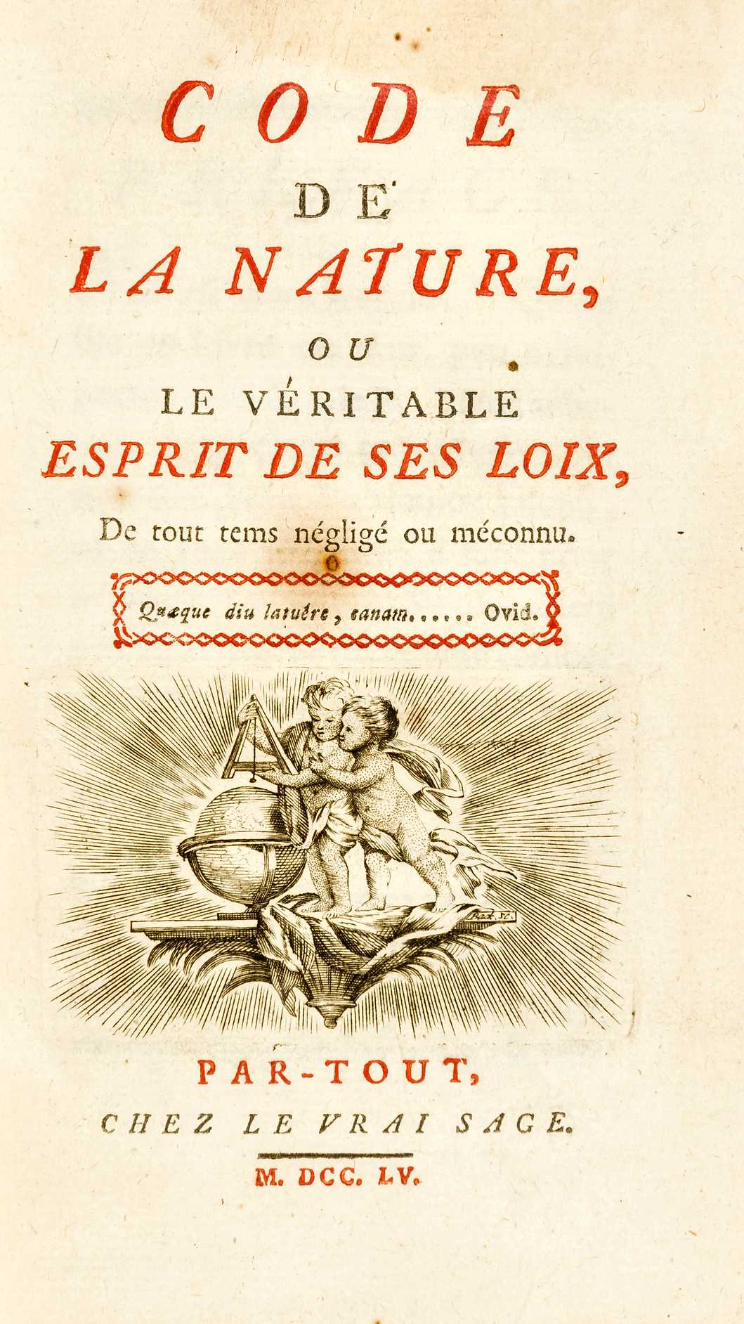 Morelly, "Code de la Nature ou Le véritable esprit de ses loix", publié sans lieu ni nom d'éditeur : "Par-Tout, Chez le Vrai Sage. M. DCC. LV" (1755), Quatrième partie, Modèle de législation conforme aux intentions de la nature, "Lois fondamentales et sacrées — Qui couperoient racine aux vices et à tous les maux d'une Société", dans l'édition publiée "avec notice et table analytique par Edouard Dolléans... Paris, Librairie Paul Geuthner, 1910", p.85-86