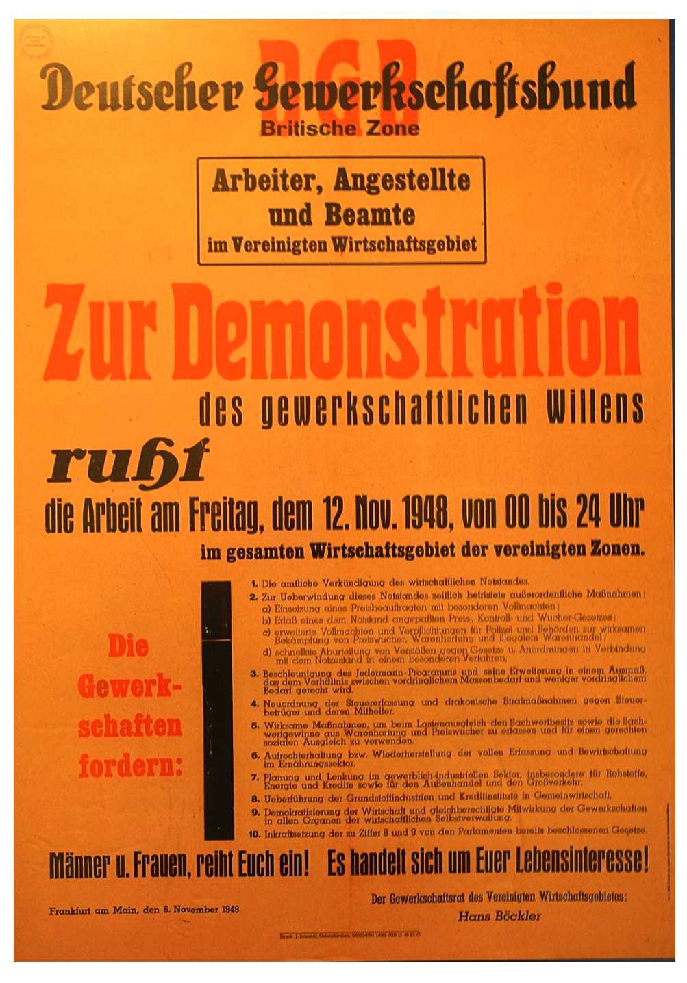 Affiche de la Deutscher Gewerkschaftsbund (DGB) : "Confédération allemande des syndicats", appelant à une grève de 24 heures le 12.11.1948 dans la Bi-Zone