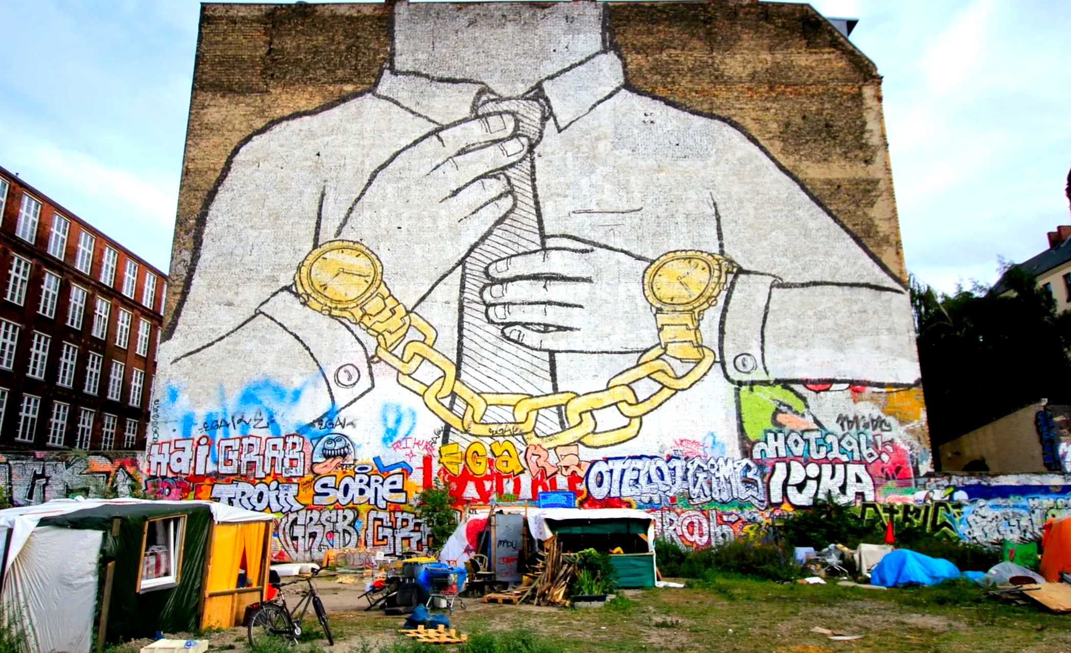 "Chain", Fresque murale de l'artiste italien Blu, Berlin, quartier Kreuzberg, 2007. L'artiste militant l'a fait disparaître en 2014 en la