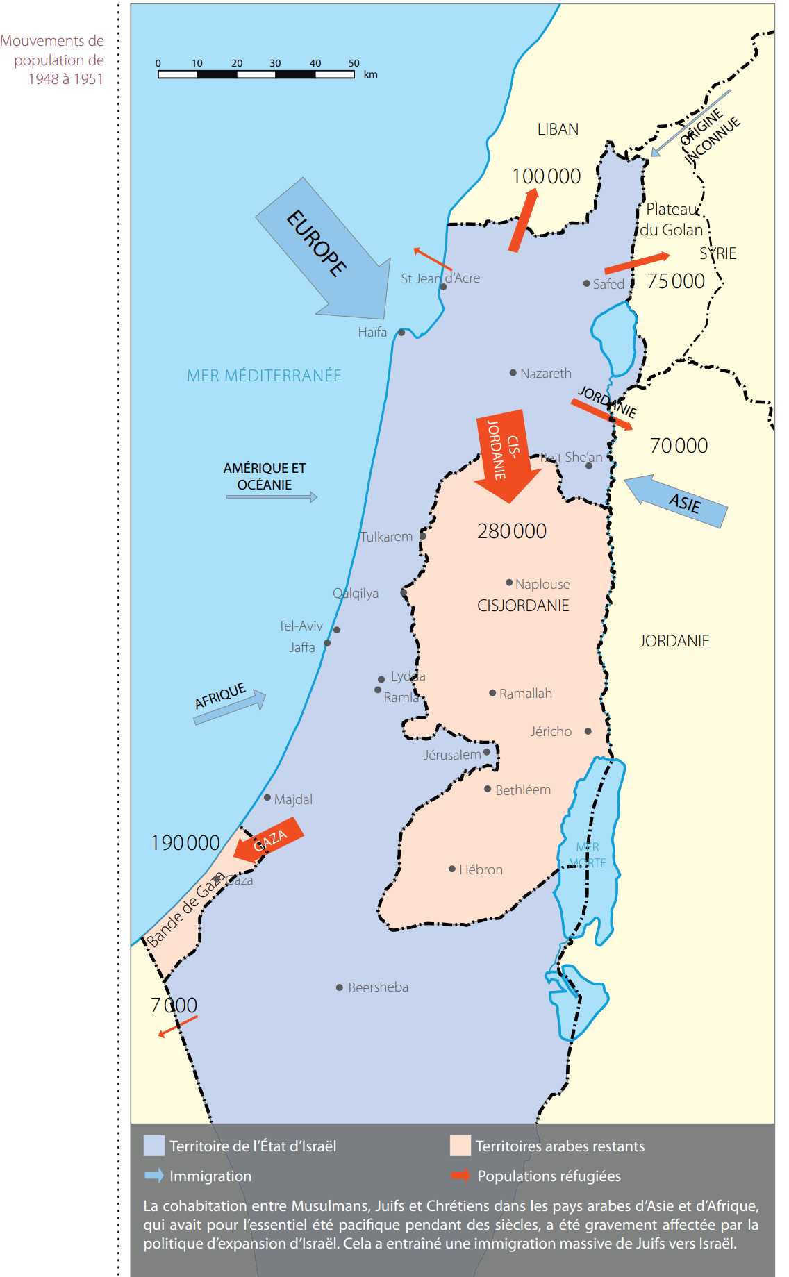 Carte des mouvements de population pendant la Nakba, entre 1948 et 1951.