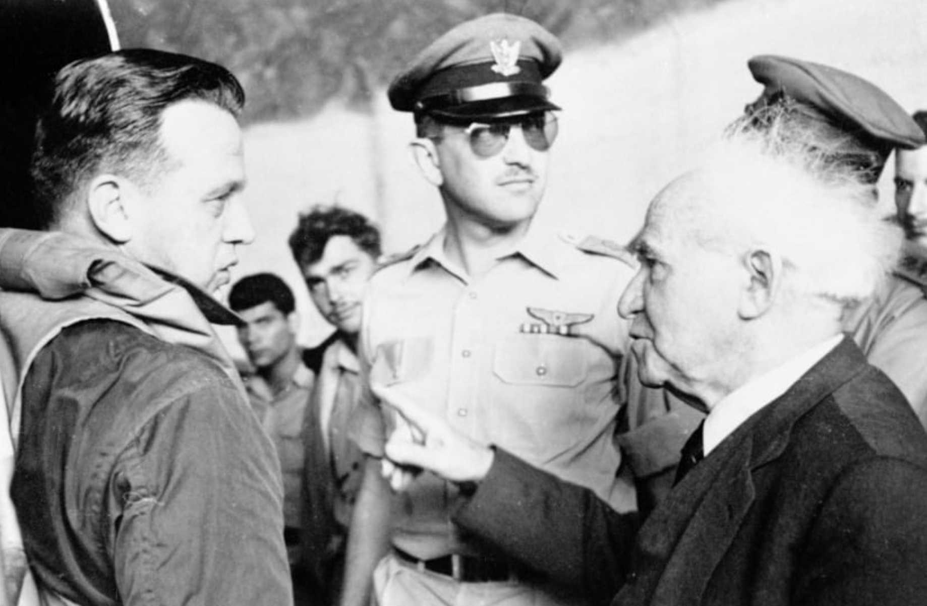 Ben Gourion avec deux pilotes juifs à l'entraînement en Tchécoslovaquie, le Colonel Daniel Shapiro, à gauche, et le général Ezer Weizman, commandant en chef de l'Armée de l'air, 1948.