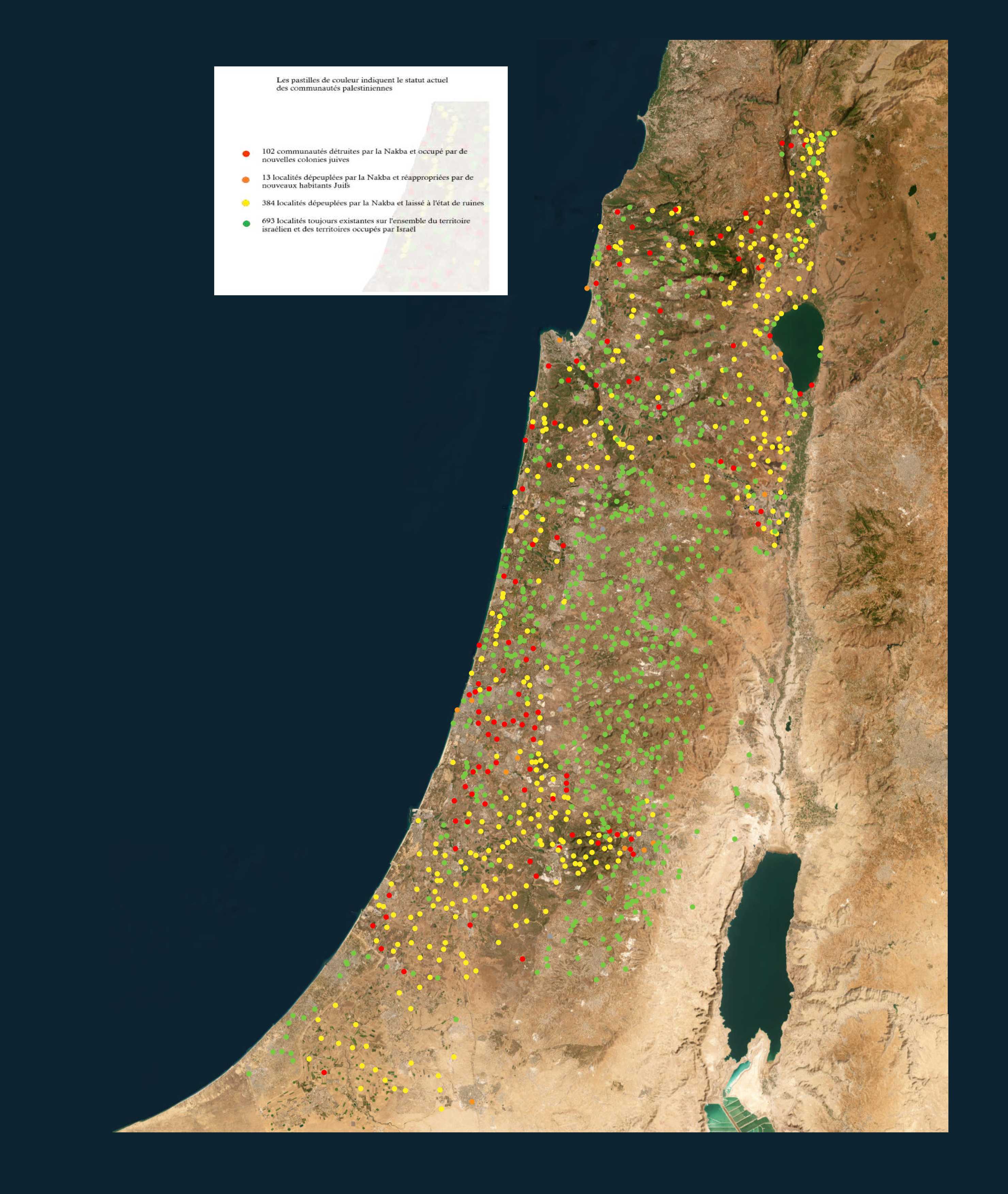 On remarquera sans étonnement que les régions palestiniennes dépeuplées, dont les localités étaient détruites, laissées à l'état de ruines ou réoccupées par Israël, épousent largement celles de l'implantation des communautés juives depuis le début de la colonisation sioniste. Précisons que beaucoup de villages préservés en 1948 ont été "progressivement et méthodiquement rasés dans les années 1950 et 1960." (Masalha, 2012 : 107)