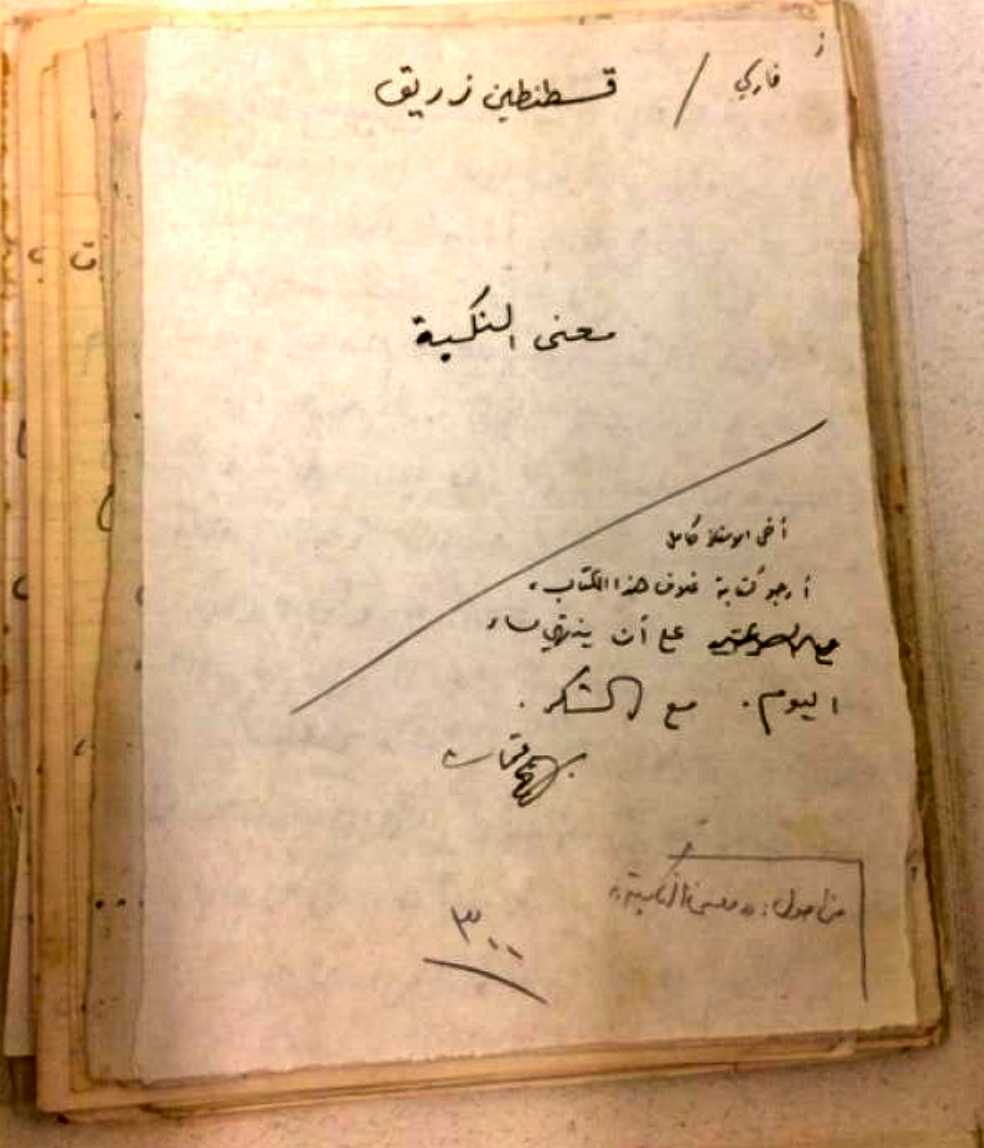 Pour Zureiq, ce n'est "ni une calamité passagère ni une simple crise, mais une catastrophe (Nakba) dans tous les sens du terme, la pire qui soit arrivée aux Arabes dans leur longue histoire pourtant riche en drames." Soulignons qu'il n'est pas le premier à utiliser ce terme pour désigner un cataclysme d'ordre politique. C'est par exemple ainsi que les Arabes ont désigné l'année 1920 ("âm an-nakba" : "l'année de la catastrophe"), représentée par "l'écroulement du rêve du grand royaume syrien." (Weinstock : 2011). Pour le sociologue israélien Baruch Kimmerling (1939-2007), ce qui s'est alors produit est un "« politicide » du peuple palestinien comme la tentative progressive mais systématique de provoquer leur annihilation : « la dissolution de l’existence du peuple palestinien en tant qu'entité légitime, sociale, politique et économique. » (KImmerling, 2003).