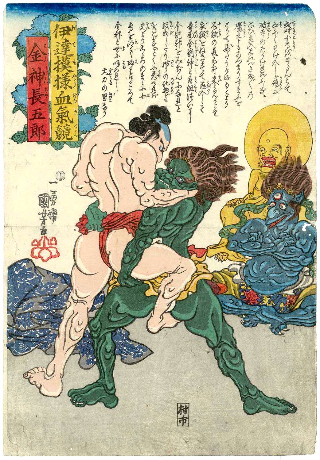 Le lutteur Konjin Chogoro jetant à terre un diable