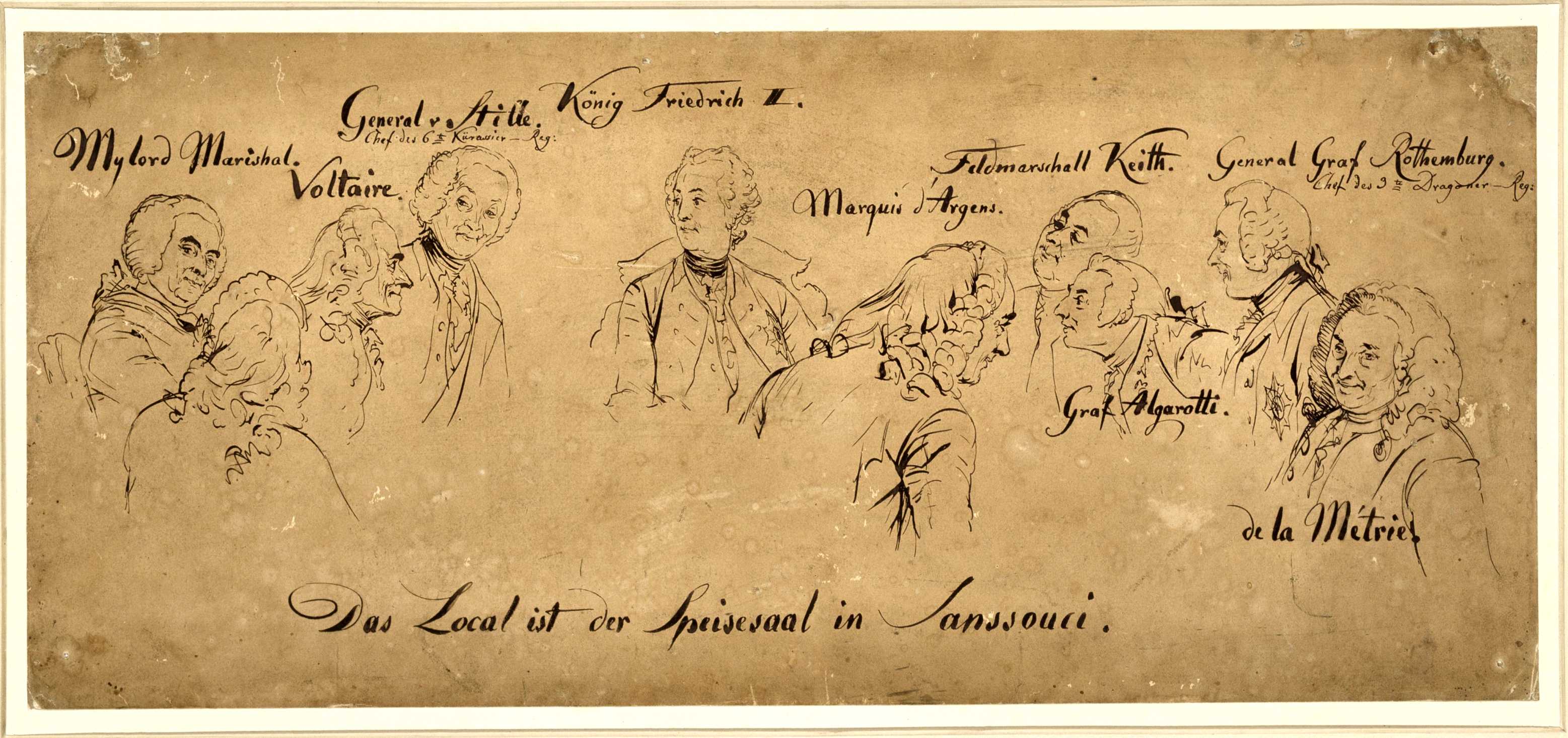 De gauche à droite : Anonyme ; George Keith dit Mylord (Milord) Marishal ; Voltaire (s'adressant à Algarotti) ; Le général Friedrich von Stille ; Le roi Frédéric II de Prusse ; Feldmarschall (Maréchal) James Francis Edward Keith (frère du précédent) ; Le Comte Francesco Algarotti ; Le comte Friedrich Rudolf von Rothenburg ; Julien Offray de La Mettrie (Métrie) ; Jean-Baptiste de Boyer, marquis d’Argens.