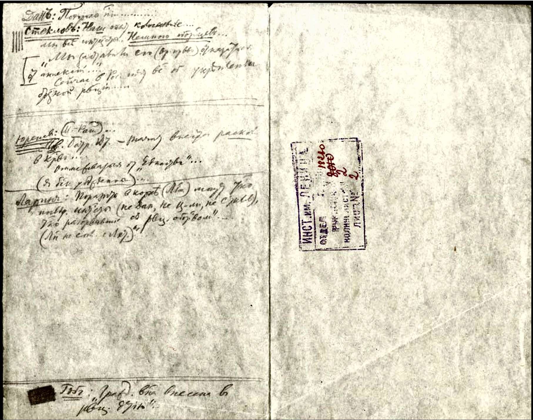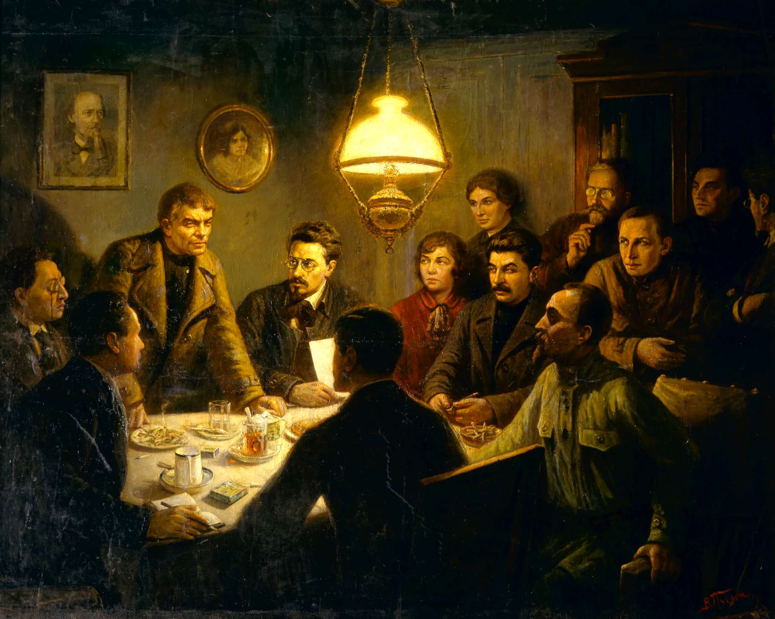 " Pchelin a achevé le tableau en 1929, quand l’équilibre des pouvoirs au sommet du Parti bolchevique avait radicalement changé. Dans la lutte pour le pouvoir, Staline avait gagné. Il est représenté dans un gros plan du tableau assis à une table. Dans l’ombre près du placard se trouvent les perdants, mais pas encore appelés « ennemis du peuple », Zinoviev et Kamenev. Et le leader n° 2 de la Révolution d’Octobre, Trotsky, privé de tous les postes d’État et ayant complètement perdu son poids politique, semble être à moitié absent de l’image : il est représenté se détournant au bord même de la toile. Sans un pince-nez bien en vue et un « poil de coq démoniaque », il est tout simplement méconnaissable."