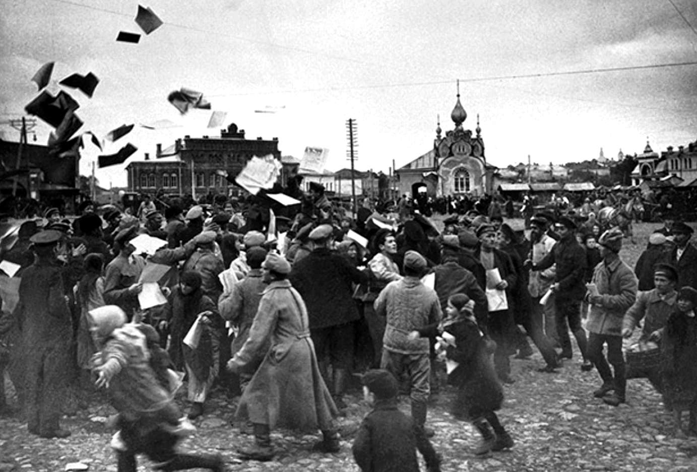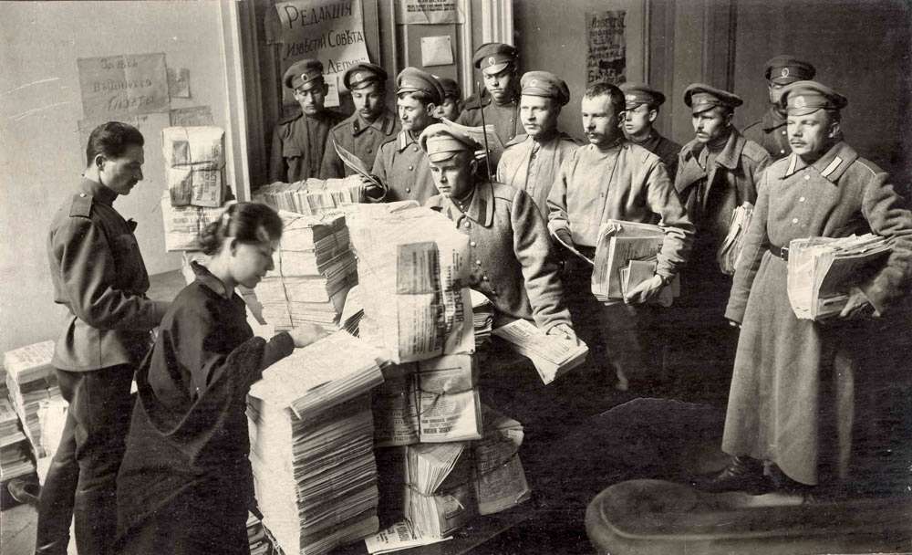 Pour trouver un mouvement radical chez les bolcheviks, il fallait alors se tourner vers le comité du district de Vyborg, toujours dans la capitale Petrograd, le plus organisé, le plus combattif contre la bourgeoisie, et qui avait une influence sur Krondstadt et Helsingfors, des bastions du bolchevisme pendant cette période. Le 27 février, il distribuait un tract qui appelait à élire un soviet pour lui transférer tous les pouvoirs, décision votée à l'unanimité dans les usines. Le 5 mars, un projet du même comité réclamait "l'organisation de l'armée sur des principes démocratiques, la confiscation des terres et la satisfaction de toutes les autres revendications du programme minimum..." (Cliff, 1976, chapitre 7). Quand le 5 mars, le Soviet de Petrograd vota à la quasi-unanimité la reprise du travail, le Comité de Vyborg rejeta la décision, la subordonnant à diverses exigences répétées depuis longtemps : instauration d'une république démocratique, journée de huit heures, augmentation de salaire, confiscation des terres, etc., mais aussi, un mot d'ordre de fin à la guerre. Pour enrayer ce pacifisme, l'Etat tente de convaincre par une propagande patriotique : tracts, journaux, et même films, avec le Comité Skobelev, dont la section cinématographique, placée sous la tutelle de l'état-major, avait le monopole des images du front et qui, après la révolution de février, prend son indépendance et se met au service de la cause démocratique. On citera, par exemple le film de Ladislas Starevitch, Pour le pouvoir du peuple, mêlant fiction et documentaire dans un but pédagogique, pour expliquer la loi électorale, la procédure du vote, etc. Parallèlement, fleurissent moult dictionnaires et lexiques bon marché pour apprendre à être un bon citoyen, se familiariser avec le nouveau vocabulaire politique, etc. (Sumpf, 2017/b).