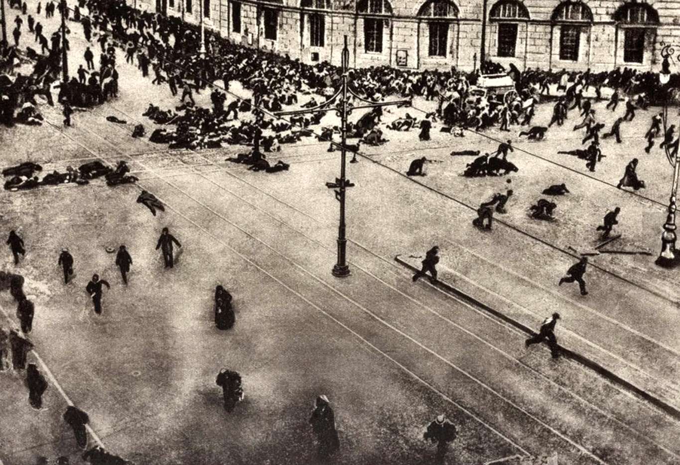 Le tsar ordonne au général Sergueï Khabalov de rétablir l'ordre par la force, et le 27 février, les soldats ouvrent le feu à quatre endroits du centre-ville, munis d'une mitrailleuse en plus de leurs fusils, et font une quarantaine de tués et autant de blessés. De 25.000 à 70.000 soldats quittent les casernes, ce jour-là pour rejoindre la foule des manifestants, qui se dirige vers le palais de Tauride, où siège la Douma :