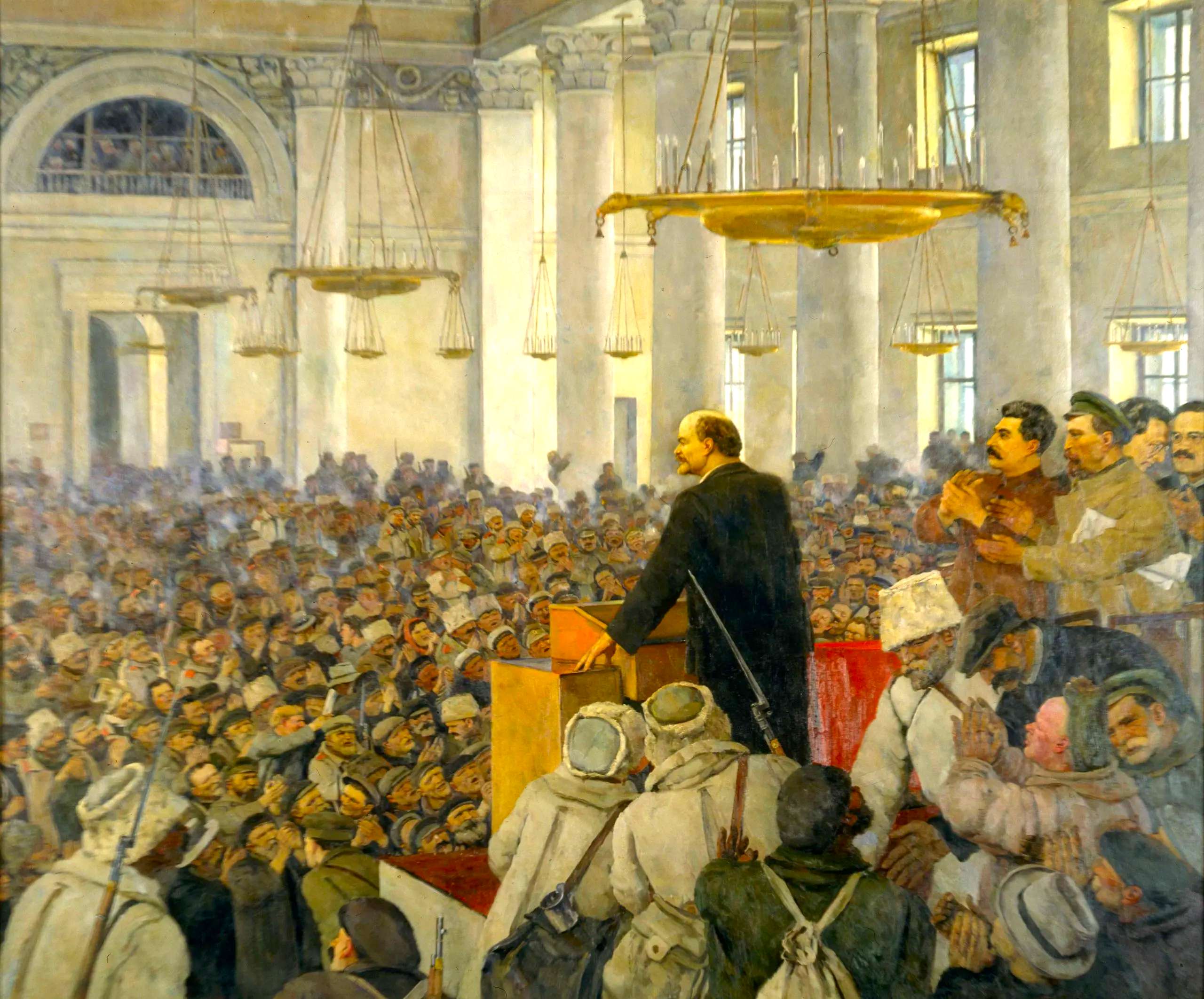 "Le Congrès des Soviets des députés ouvriers, soldats et paysans de la Russie décrète : Pour diriger le pays jusqu'à convocation de l'Assemblée constituante, un gouvernement provisoire d'ouvriers et de paysans sera formé qui portera le nom de Conseil des Commissaires du peuple. L'administration des différentes branches de la vie de l'Etat est confiée à des commissions dont les membres devront assurer la mise en pratique du programme proclamé par le congrès, en étroite union avec les organisations de masse des ouvriers, des ouvrières, des matelots, des soldats, des paysans et des employés." (Décret sur la formation du gouvernement ouvrier et paysan, 26 octobre / 8 novembre 1917, publié dans le journal «Rabotchi i Soldat» n° 10, 27 octobre (9 novembre) 1917). La grande ambiguïté de ce texte représente un des problèmes les plus cruciaux que pose d'emblée le pouvoir bolchevique (et qui se pose dans toutes les révolutions et même les "démocraties") et que nous n'aurons de cesse d'explorer. Ceux qui dirigent le gouvernement des ouvriers et des paysans ne sont ni ouvriers ni paysans. Lénine et les chefs bolcheviques, nous le verrons dans la prochaine partie, ont certes des arguments à faire valoir pour opérer de manière dirigée dans la période révolutionnaire, et encore plus de guerre civile, en exerçant un contrôle du haut vers le bas, mais ce pouvoir, nous le verrons ne manquera pas de soulever des questions sur les contradictions entre le grand projet humaniste affiché et défendu par Lénine, et sa réalisation.