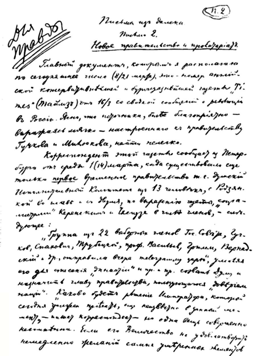 De son lieu d'exil, où lui et sa femme vivaient assez pauvrement, Lénine trépigne contre le social-patriotisme de Kerensky, le social-pacifisme de Tchkhéidzé, l'opportunisme de Kamenev, et commence à passer à l'offensive en écrivant de Zürich ses cinq Lettres de loin, entre le 7 et le 26 mars, à destination du parti et de la classe ouvrière. La première rappelle que la révolution de février a été aussi rapide grâce aux "grandes batailles de classe" du prolétariat au cours des années révolutionnaires 1905-1907. Par ailleurs, Lénine porte toujours la même radicalité contre les "possesseurs de millions de déciatines de terre" (Lettres de loin, 1e lettre du 7/20 mars 1917) et affirme que c'est au prolétariat, aux pauvres, représentant neuf dixièmes de la population, de prendre en la direction du pays. Comme il l'a toujours prôné, il appelle une nouvelle fois à la guerre civile : "Aidez les ouvriers à s'armer ou du moins ne les en empêchez pas, et la liberté sera invincible en Russie, la monarchie impossible à restaurer, la république assurée" (op. cité). De même, Lénine pense toujours que les meilleurs alliés du prolétariat sont toujours les petits paysans, puis, en deuxième lieu, le prolétariat "de tous les pays belligérants et de tous les pays en général" (op. cité).