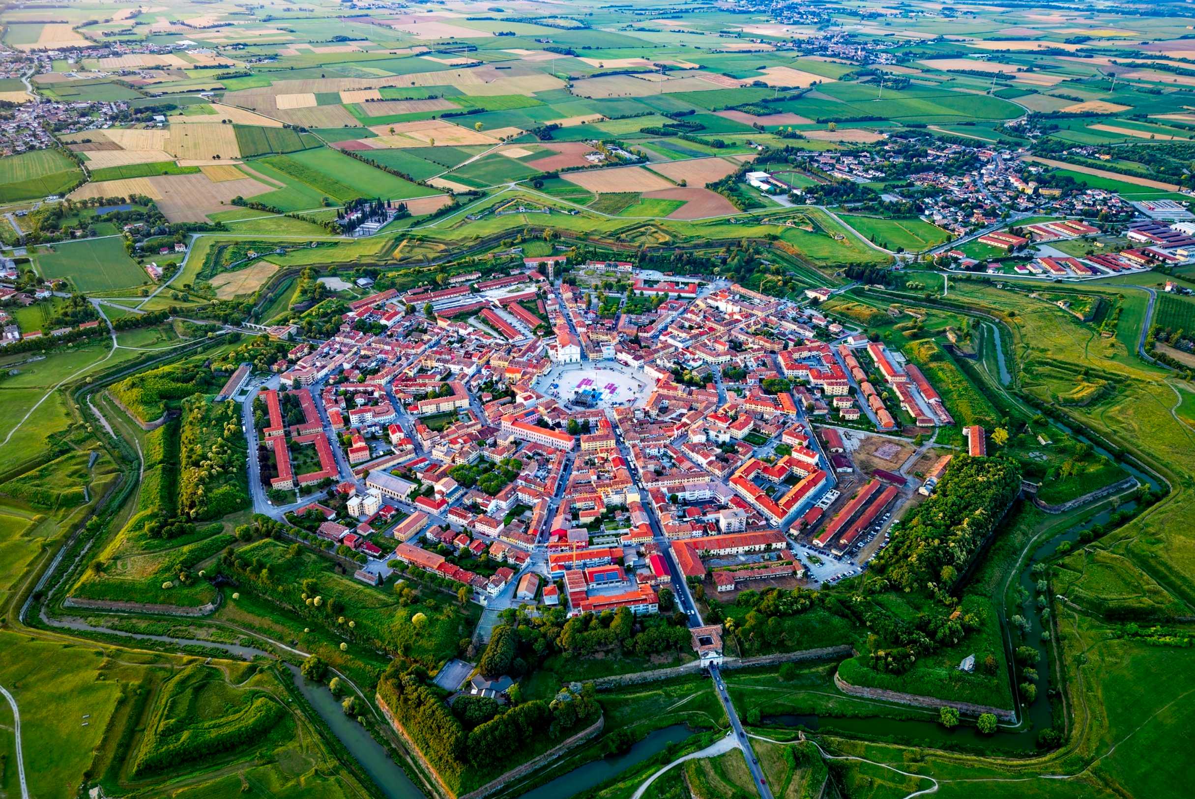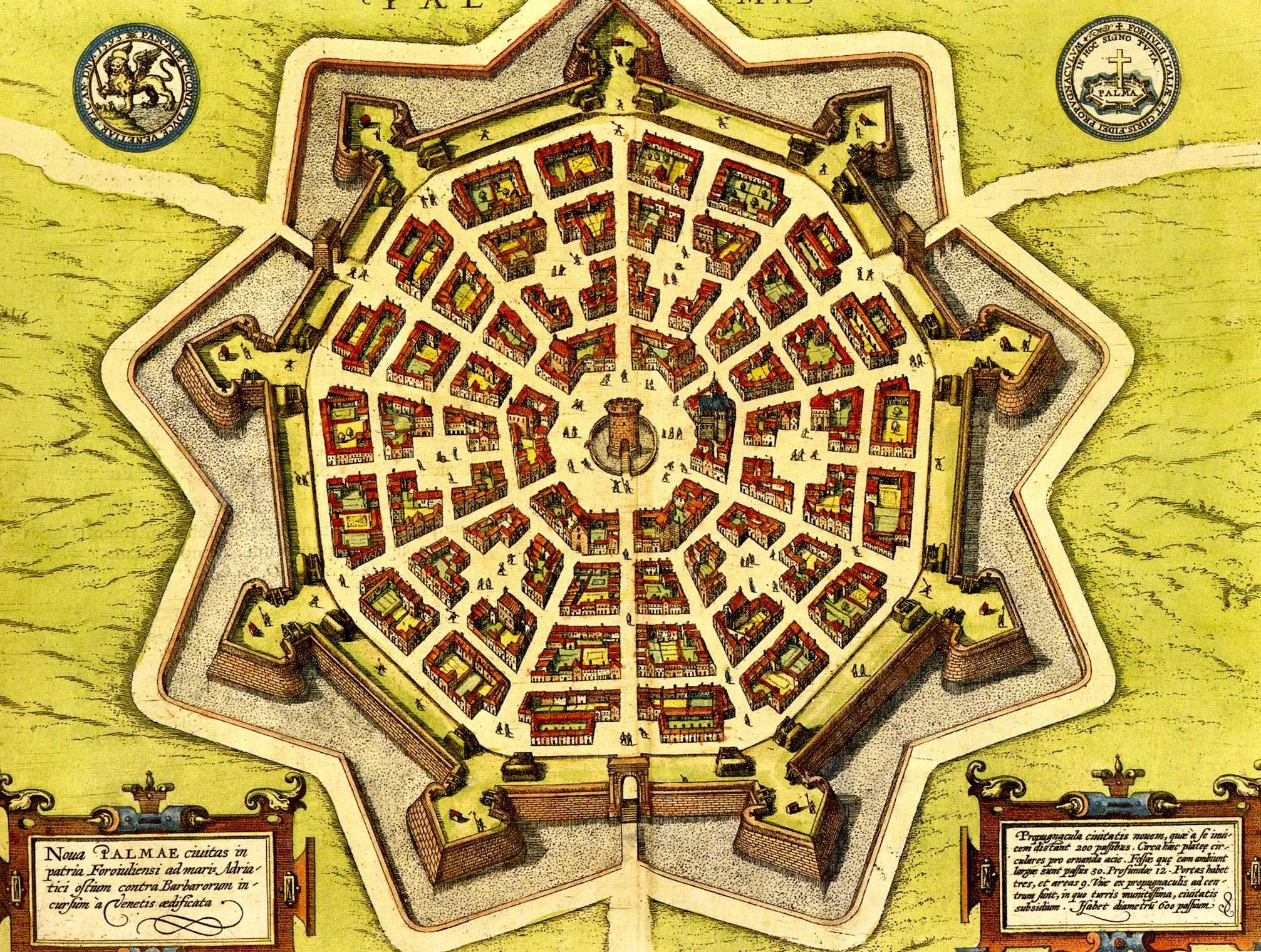 Palmanova, province d'Udine, région autonome du Friuli-Venezia Giulia (Frioul-Vénétie Julienne), en Italie, ville fortifiée fondée en 1593, dont le plan ennéagonal (nonagonal) a été conçu en partie par l'architecte militaire Giulio Savorgnan (Savorgnano) et l'architecte Vincenzo Scamozzi. L'inspiration de cette cité-forteresse idéale a probablement été influencée par l'Utopie de Thomas More.