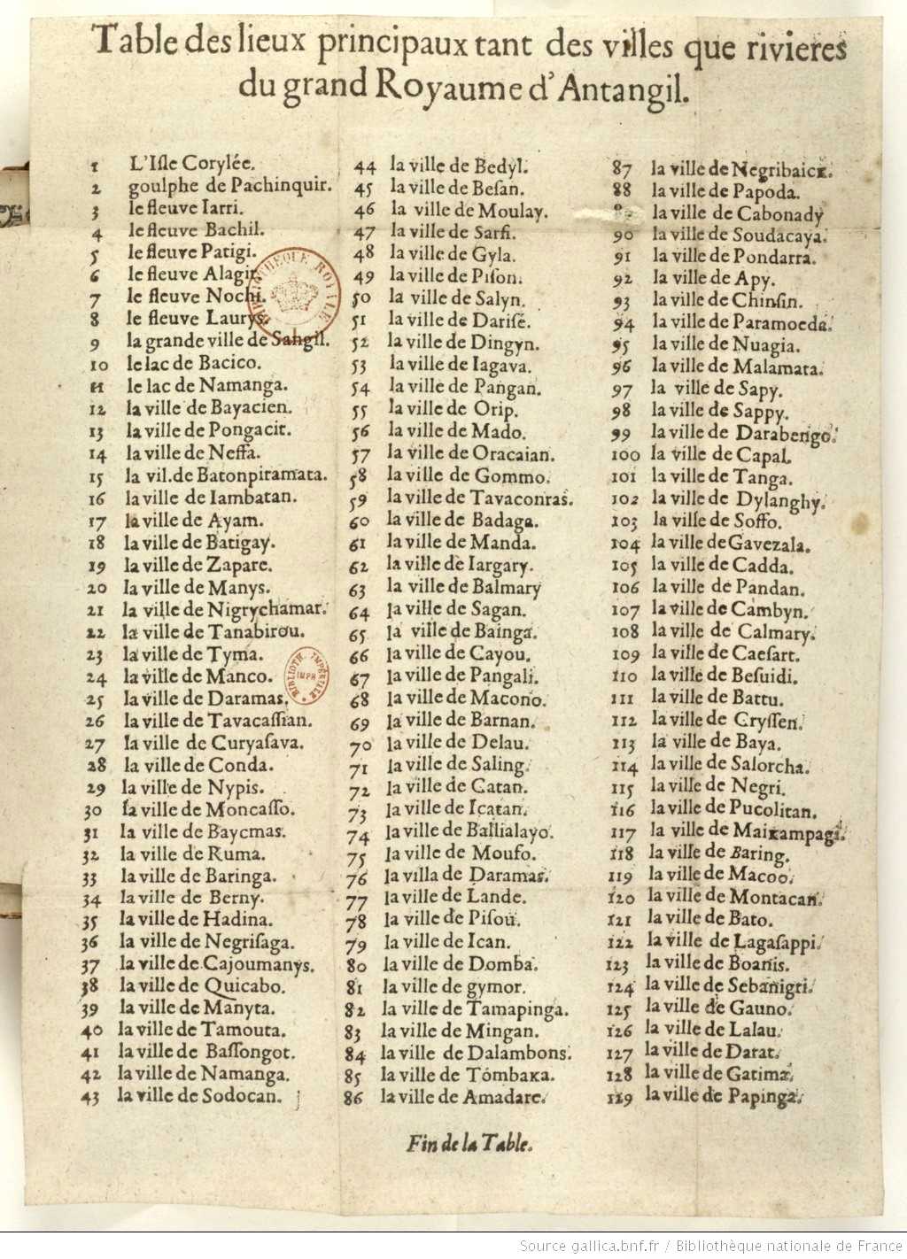 Viragina : « "La Nouvelle Gynée, que d’autres appellent de manière incorrecte Guinée, je l’appelle plus justement Viraginia, située où les géographes européens ont dépeint la terre des perroquets" [psittacorum regio, NDA]. L’auteur fait mine de corriger les « géographes européens » sur une erreur qui n’en est pas une, mais donne l’occasion d’un jeu de mots rabelaisien : la Nouvelle Guinée, dont les côtes sont reconnues par les navigateurs portugais et espagnols dans la première moitié du XVIe siècle, serait plutôt une nouvelle Gynée, un pays des femmes. »