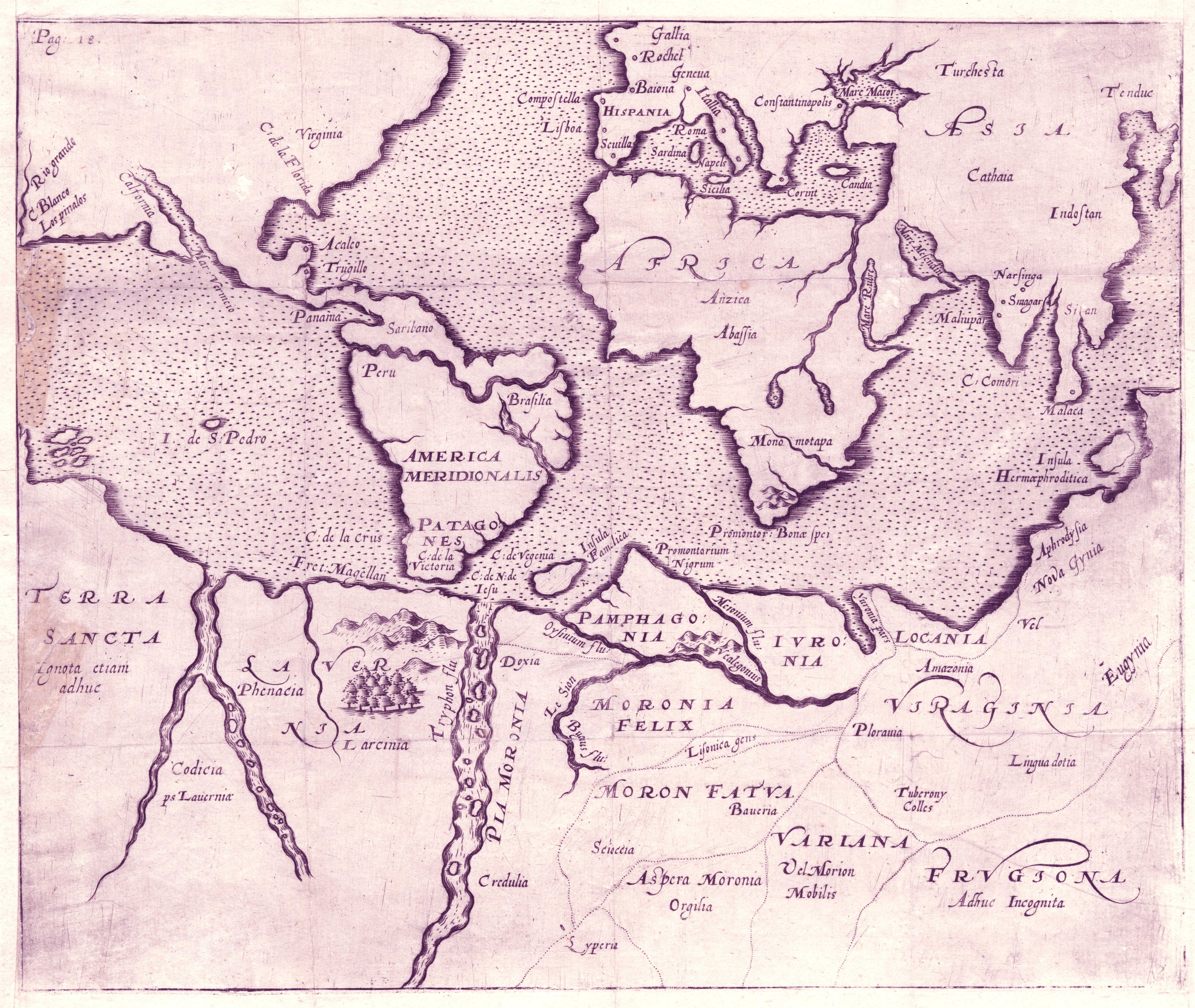 Le Mundus de Joseph Hall (1574 - 1656), est une dystopie connue après la première édition sous le titre de "Mundus alter et idem. Sive terra australis antehac semper incognita", publié sous le pseudonyme de Mercurius Britannicus en 1605, où le personnage principal, Mercurius, tente de convaincre le Français Petro Beroaldo (Beroaldus) et le Belge (Belga, traduit souvent par Hollandais) Adriano Cornelii Drogio (Adrian Cornelius Drogius) de monter à bord du Phantasia pour participer à un voyage vers différentes régions de cet "autre monde" (an Old World and a New). Les récits utopiques s'inspirent souvent d'une longue tradition de géographie mythique, et tout particulièrement celle de régions mystérieuses et inconnues des "terres australes". Mais cette fois, la géographie s'inspire de l'idéologie chrétienne et représente les "allégories morales des vices régnant sur l’Europe : Crapulia et Yvrognia, dont les noms parlent d’eux-mêmes, Viragina (pays gouverné par les femmes), Moronia (pays des sages-fous), Lavernia (pays des voleurs)...À côté de Loçania (terre de la luxure), on croise une Aphrodisya, une Gynaecopolis et une Amazonia parmi les espaces visités à Viragina, ou encore une Languedocia (allusion à l’intempérance verbale féminine, autant qu’à la région française)" (Correard, 2018).